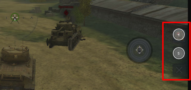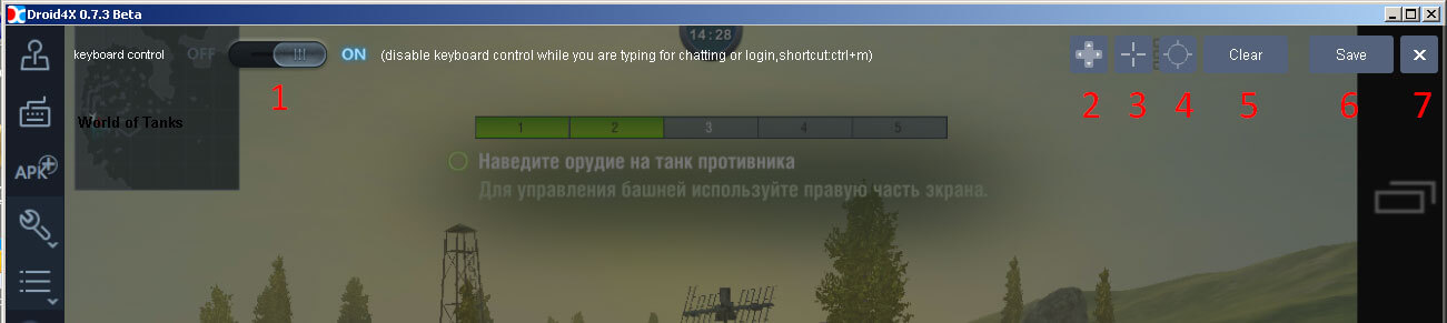 Нажмите левой кнопкой мыши на кнопку управления передвижением, и не отпуская ее перетяните в левый нижний угол (обычно управление передвижением находится именно там) точно на то место, где оно находится. Таким же способом переместите курсор управления мышью (цифра 3 на скриншоте выше) точно в центр. Во время игры обзор с помощью мыши включается нажатием правой кнопкой мыши. Кнопку управления выстрелом(цифра 4) так же переместите на соответствующую кнопку. В конечном итоге у Вас должно получится следующее: Если во время настроек кнопки легли немного не ровно, все можно сбросить с помощью кнопки Clear. По окончанию настроек нажмите кнопку Save, что бы сохранить настройки. Настройка дополнительных кнопок управления Во многих играх не достаточно просто настроить управление, обзор и кнопку ведения огня. Часто используются и другие кнопки, например в WoT Blitz это использование расходников или включение снайперского режима. Все эти кнопки так же можно перенести на клавиатуру. Перейдите в настройки клавиатуры в эмуляторе, и на области, где необходимо добавить кнопку, просто нажмите левую кнопку мыши, у вас появится кружок, куда необходимо ввести цифру с клавиатуры, которая будет отвечать за нажатие на данный участок. Нажмите кнопку Save для сохранения всех настроек.