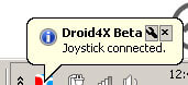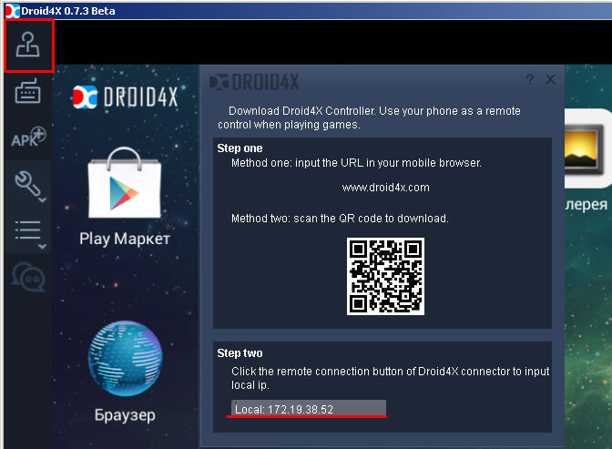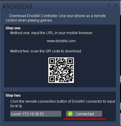 выберите необходимую операционную систему, скачайте установщик и установите у себя в телефоне Dorid4X. Далее, для сопряжения компьютера и телефона необходимо знать IP адрес компьютера, для этого щелкните по кнопке Joystick в верхнем левом углу панели управления эмулятора. В появившемся окне, с низу, будет необходимый нам IP адрес. Далее запустите приложение Droid4X на вашем мобильном устройстве и введите IP, который вы увидите на экране вашего компьютера и нажмите кнопку Connect. Важно! Для сопряжения телефона и компьютера, необходимо, что бы они были подключены к одной Wi-Fi точке, иначе они друг друга не «увидят»! При удачном подключении в области уведомлений появится значок, информирующий об успешном подключении телефона. Так же эта информация появится в самом эмуляторе Droid4X.